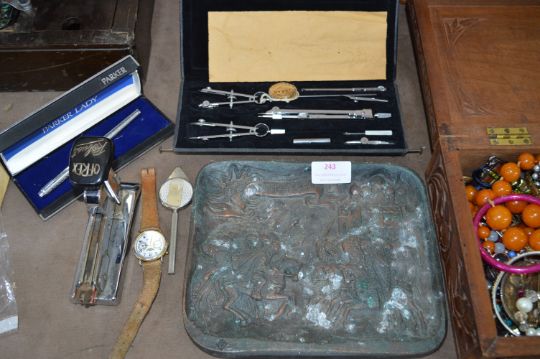Brass Plaque, Box of Technical Drawing Instrument, Wristwatch, etc.