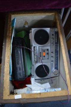 Tea Chest Containing Retro Radios, and a Household Goods