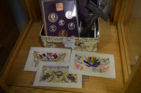 Tin of Collectibles Including Silver Cards, Coinage Set, Crucifix, Sewing Scissors etc.