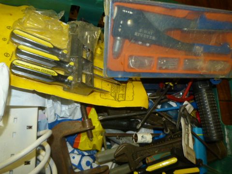 Box of Assorted Tools Including Riveter, Extension Leads, etc.