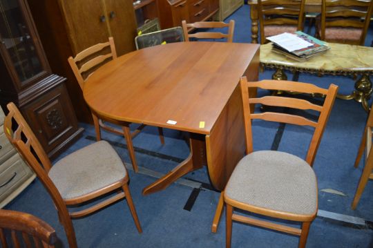 Oval Topped Teak Drop Leaf Dining Table with Four Matching Dining Chairs