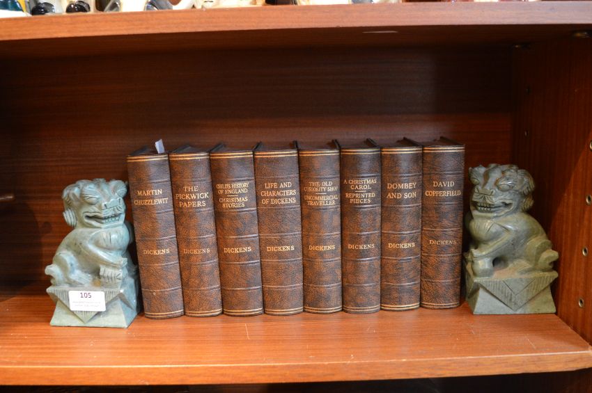 Green Soapstone Chinese Dragon Bookends and Eight Volumes of Dickens