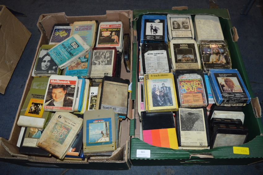 Two Boxes of 8-Track Tape Cartridges (~160 total) Including Abba, Rod Stewart, Liberace, etc.