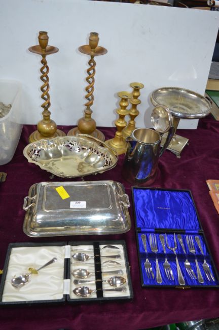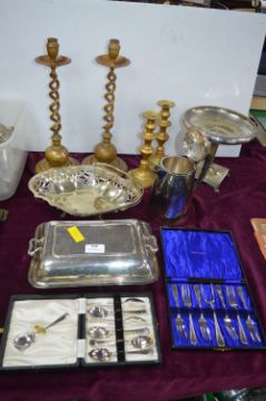 Brass Candlesticks, Plated Dishes, Cutlery, etc.