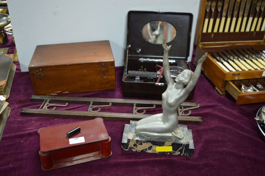 Art Deco Cigarette Box, Marble Based Figure, Bakelite Hair Dryer, Coat Rack
