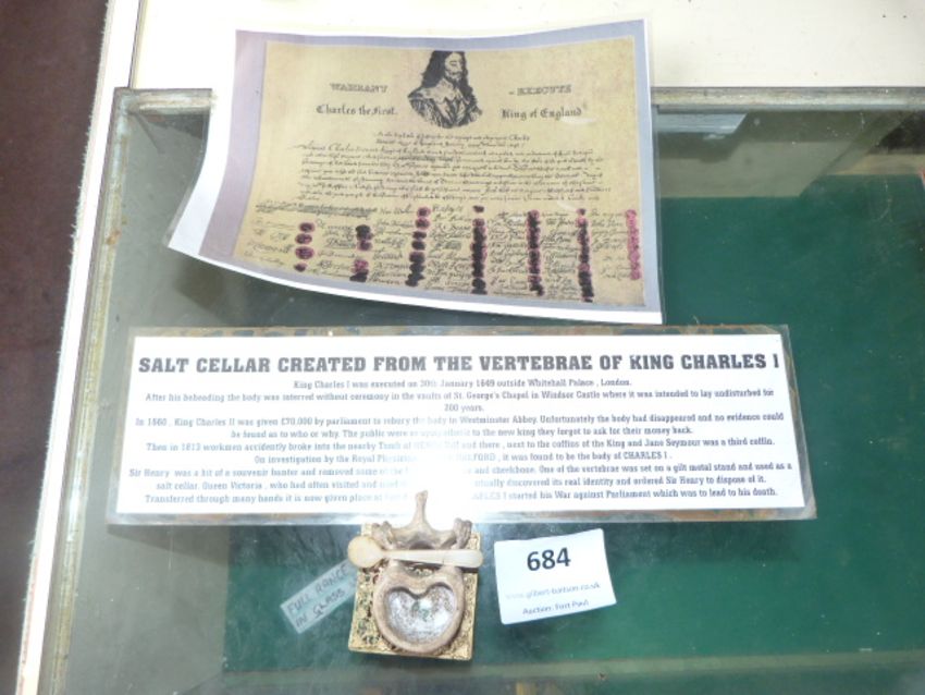 Salt Cellar Believed to be Created fro the Vertebrae of King Charles I (Executed 30th Janauary 1649 outside White Hall Palace, London) with Replica Warrant of Execution - As Displayed at the Royal Armories, Leeds Exhibition "The Killing of the King"