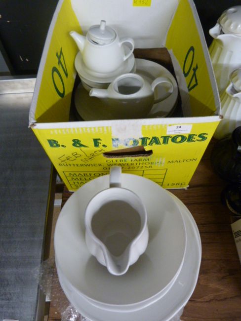 *Small Box of White China Including Teapots, Dinner Plates, Side Plates, Bowls, etc.