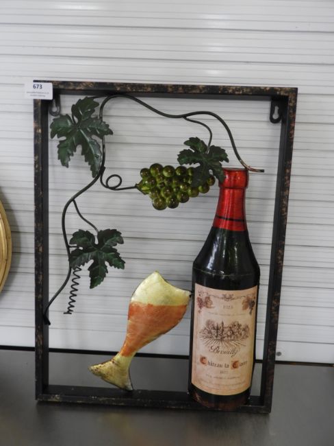 Piece of Metal Wall Art Depicting Wine Bottle and Glass
