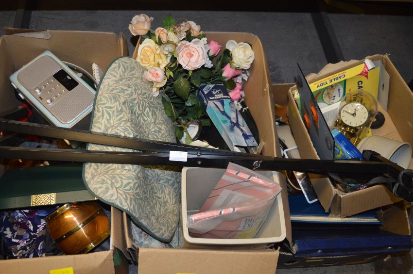 Three Boxes of Assorted Bric-a-brac, Clocks, Radio, and Decorative Items