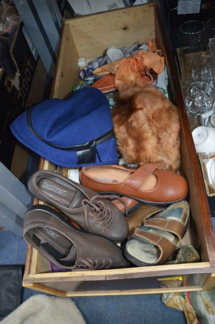Box Containing Leather Coat, Faux Fur Coat Shoes, Gloves, Scarves, etc.