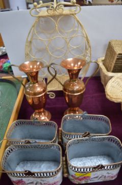 Metalware; Basket, Wine Rack and Copper Urns