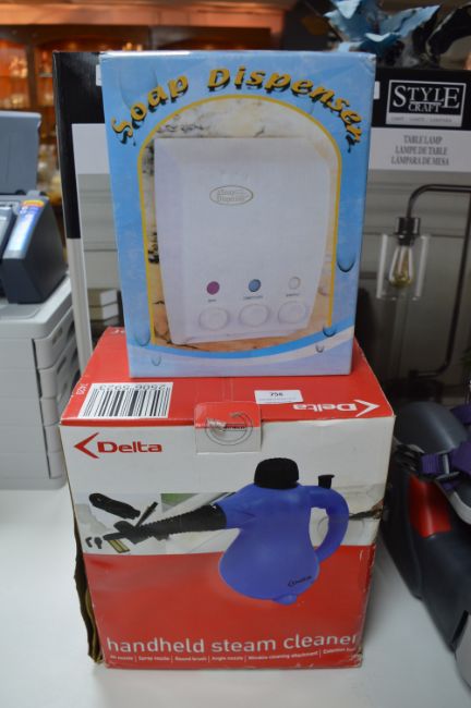 Boxed Delta Handheld Steam Cleaner, and a Soap Dispenser