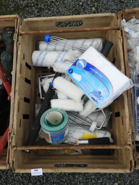 *Box of Assorted Painters & Decorators Equipment; Rollers, Sandpaper, Brushes, etc.