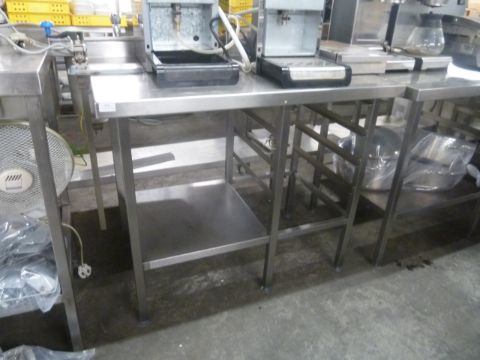 *S/S prep bench with up stand and racking and under shelf complete with bonza tin opener on left side