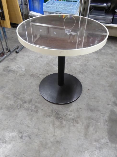 *round table with dark wood and glass tops with white trim and black pedestal bases x 2