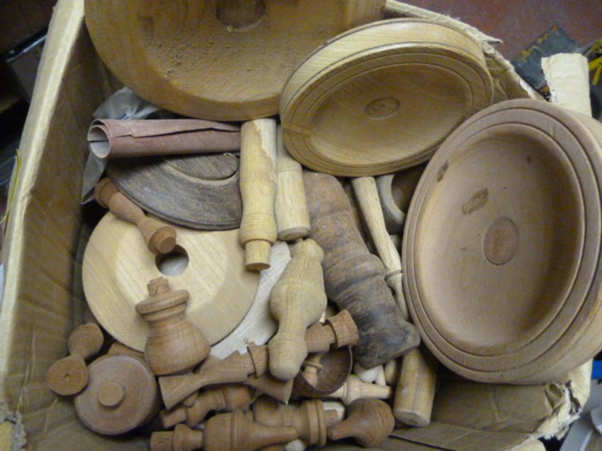 Box of Turned Wood Finials, Handles, Dishes, etc.
