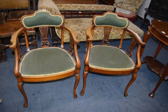 Pair of 18th Century Mahogany Armchairs on Cabriole Legs with Green Leather Upholstery