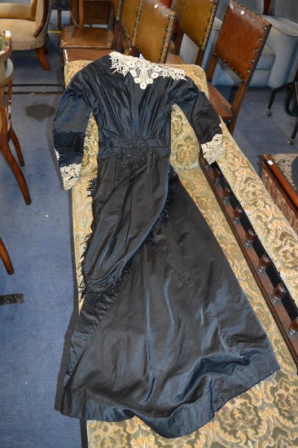 Victorian Mourning Dress in Black Silk with Applied Lace and Glass Bead Decoration