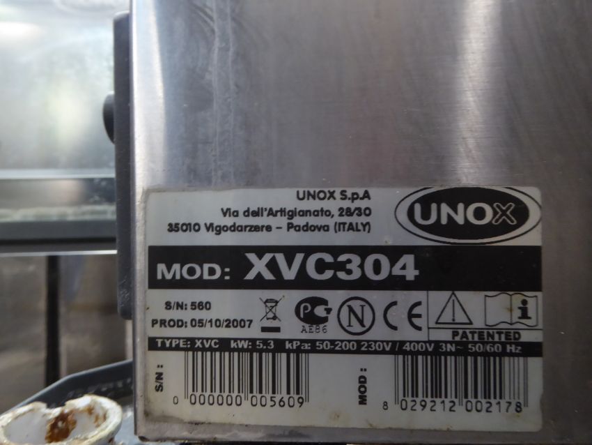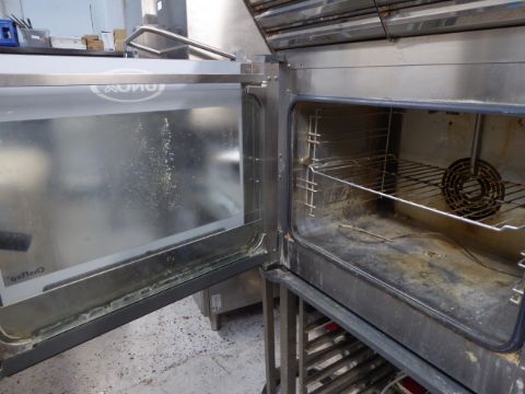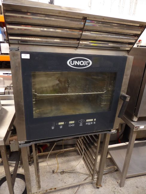 *Unox Cheftop combi oven model XVC304 - model comes with built in extractor and stand which includes tray shelves on castors. 750w x 800d x 1680h
