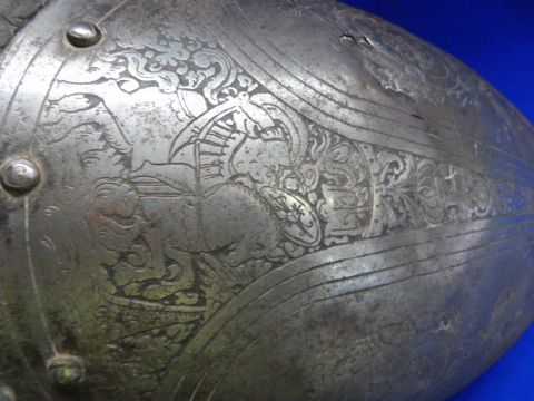 Morion Cabasset Helmet with Period Engraving Believed to be Original circa 16th - 17th Century, Some Old Damage and Hanging Clips added Later