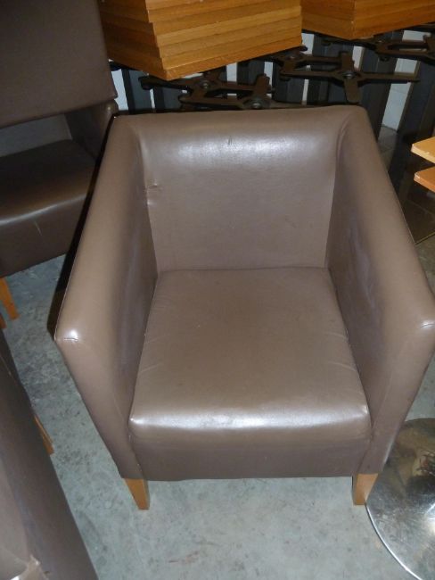 * 2 x brown leather tub chairs with wooden feet. 590w x 600d x 800h