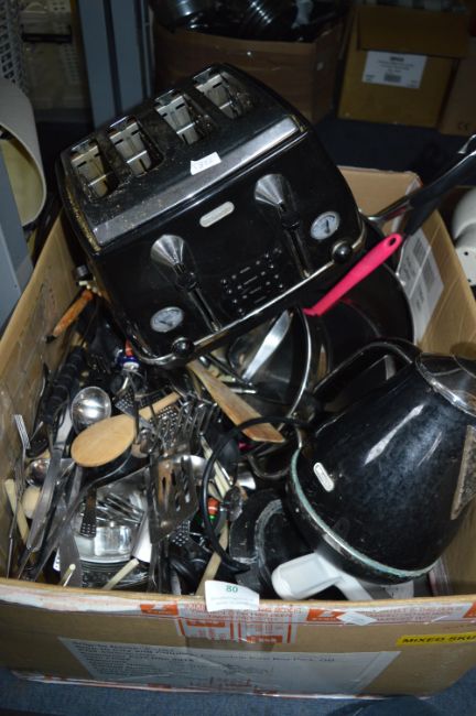 Large Box of Kitchen Utensils, Toaster, Pans, Kettles, etc.