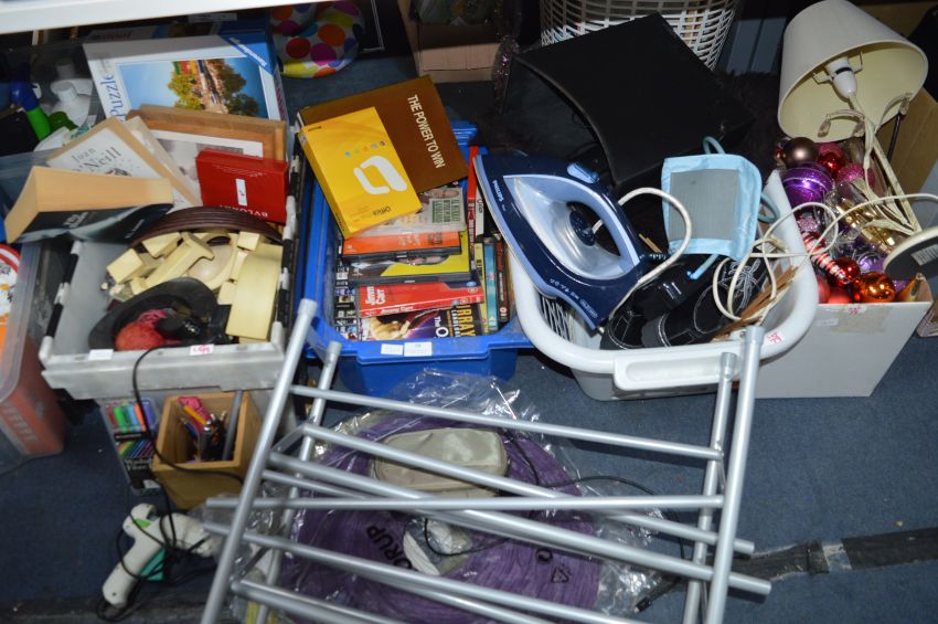 Two Tubs & Two laundry Baskets of Household Goods; Shoe Rack, Christmas Decorations, Books, DVDs, Jigsaws, etc.