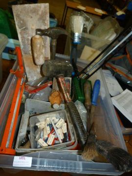 Box of Decorating and Other Tools Including Paint Brushes, Hammers, etc.