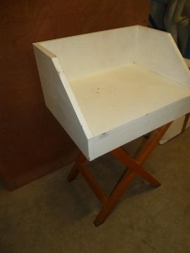 * small table with white top and wooden legs with back