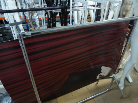 * chrome freestanding hanging rail with clips for posters at ends 1250w x 400d x 1450h