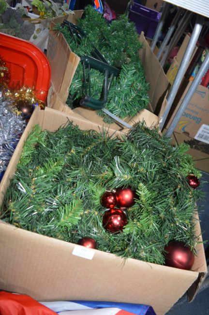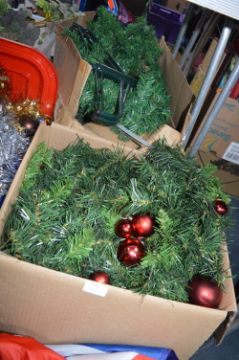 Two Large Boxes of Christmas Foliage, Baubles, Flags, etc.