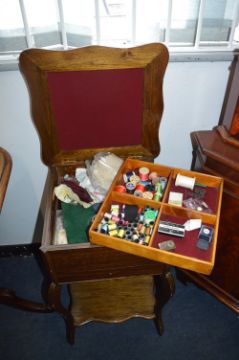 Marquetry Topped Sewing Table and Contents