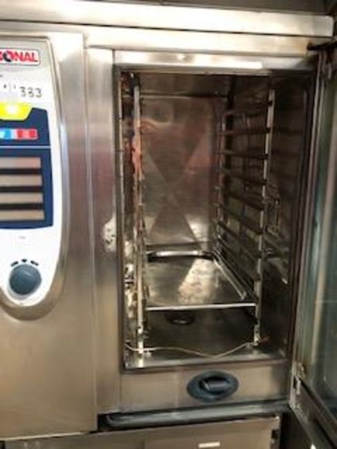 * 10 grid Rational self cooking center with heated lower hot cupboard and condenser extraction very good condition 450v Located at Grantham, NG32 2AG