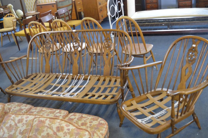 Ercol Three Piece Suite Comprising Three Seat Sofa and Two Armchairs (some faults to the webbing)