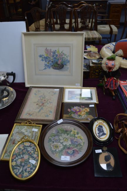 Framed Embroideries, Tapestries, and a Still Life of Flowers on Linen
