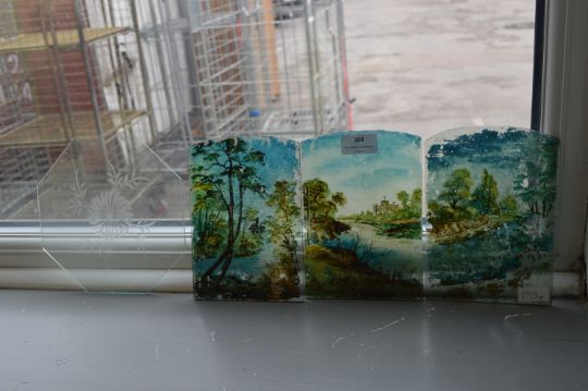 Three Victorian Painted Glass Panels Depicting a Riverside Scene