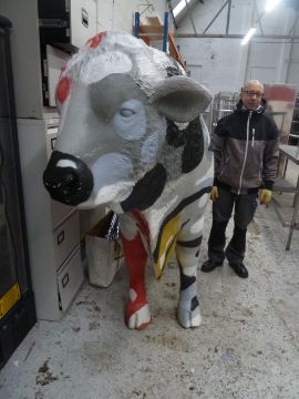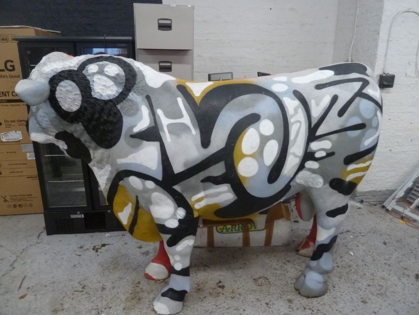 * large statement piece - life sized fiber glass cow - with grafiti. From high end steak house. One ear missing. 800w x 2400d x 1700h