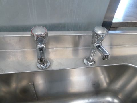 * S/S double bowl sink with small right hand draining board - complete with taps and undershelf. 1800w x 650d x 870h
