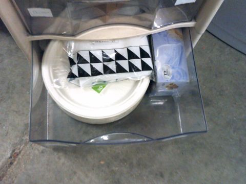 * plastic 4 drawer unit containing party supplies, etc