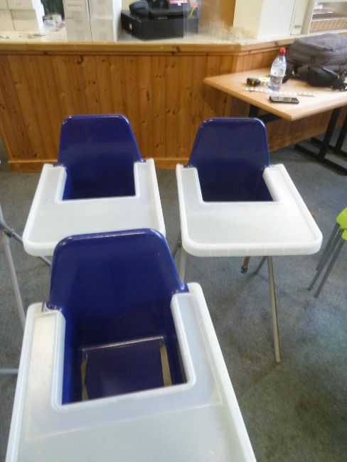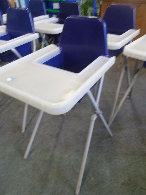 *3 x high chairs - plastic seat and tray with metal x-frame legs
