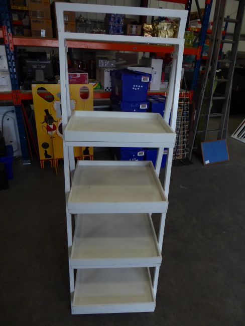 * A-frame 4 shelf stand - metal frame, white wooden shelves with lip. 1850h