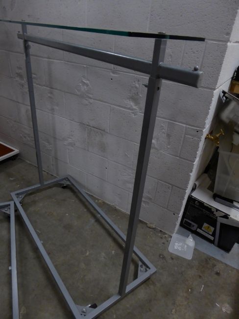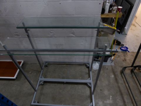* 2 x metal rails with glass over shelf on castors. Adjustable height. 1600w x 500d x 1400h (min)