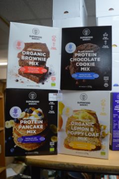 Four Packs of Superfood Bakery Gluten Free; Chocolate Cookie, Brownie, Lemon & Poppy Loaf, and Pancake Mixes