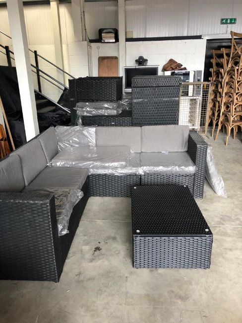 * Corner sofa with coffe table which has the option for small storage. Black wicker with grey cushion Steel frame - Collection Address Waltham Abbey, EN9 1FE - Collection Date 13th and 14th April 9am till 3pm
