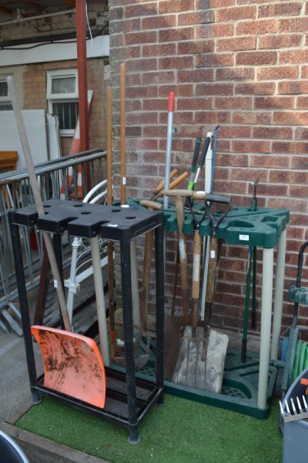 Two Garden Tool Storage Units plus Spades, Forks, etc.
