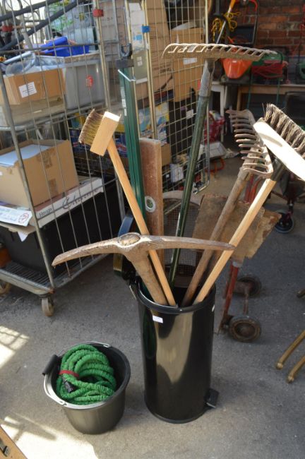 Peddle Bin Containing Garden Tools; Pickaxe, Shovels, Flexible Hosepipe, Bucket, etc.