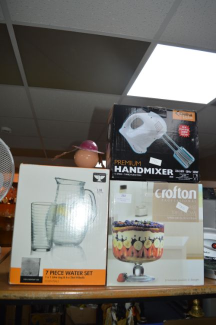 Boxed Crofton Glass Trifle Bowl, Raven Head Glass Jug Set, and a Hand Mixer