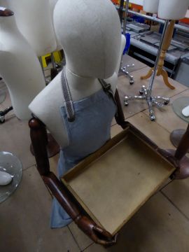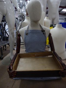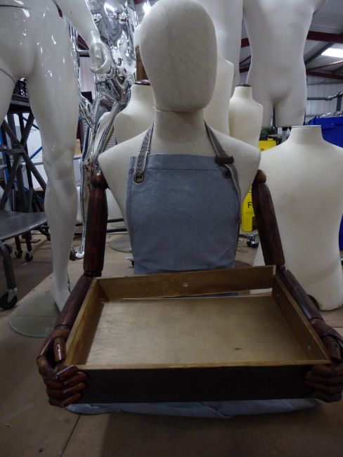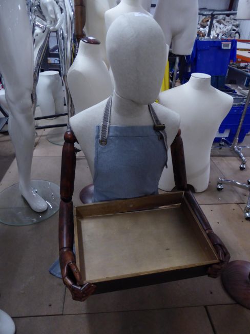 * very unusual and qwirky upper body mannequin with appron, hawking tray and wooden arms
