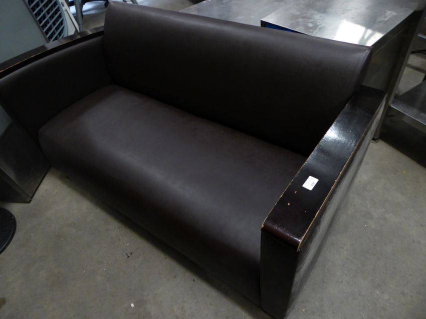 * Brown leather sofa with dark wooden arms and feet. 1450w x 700d x 700h