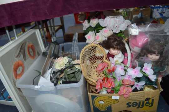 Two Boxes of Artificial Flowers, Dolls, Framed Embroidery, etc.